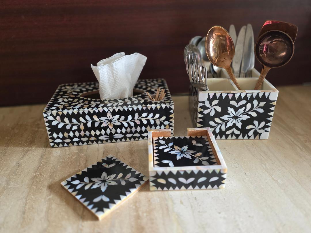 This exquisite Dharitri Creations Organizer Stand adds a touch of sophistication to your dining table or office space with our elegant Mother of Pearl.