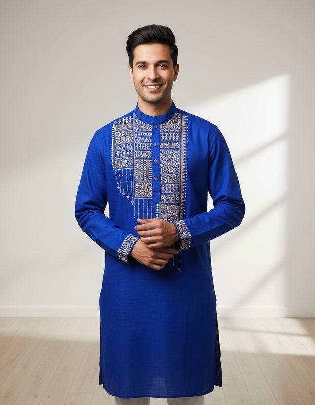 This  hand-painted men’s kurta is brought to life by skilled artisans, featuring distinctive motifs inspired by India’s traditional art forms. Thoughtfully crafted using sustainable practices, each piece reflects Dharitri Creations’ belief in preserving heritage, empowering artisans, and creating timeless elegance with a conscience
