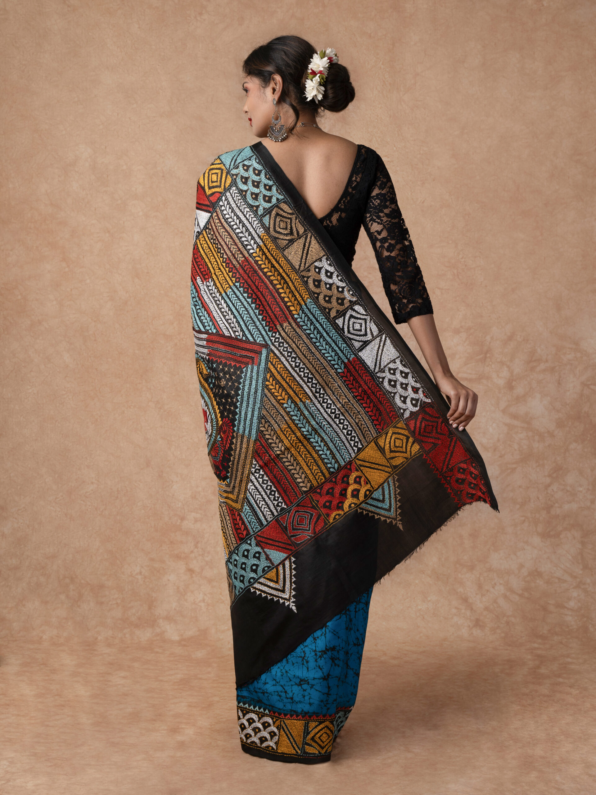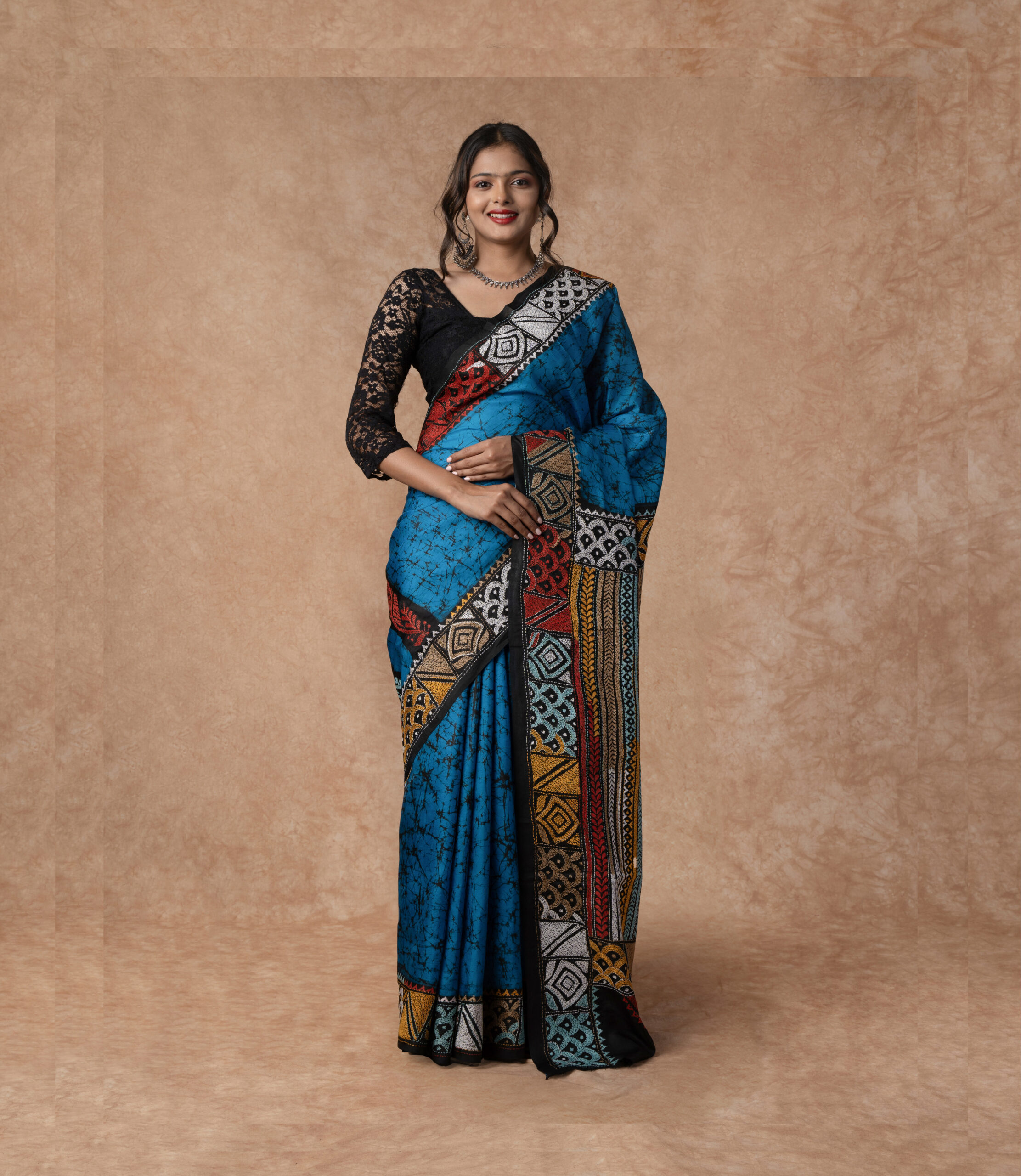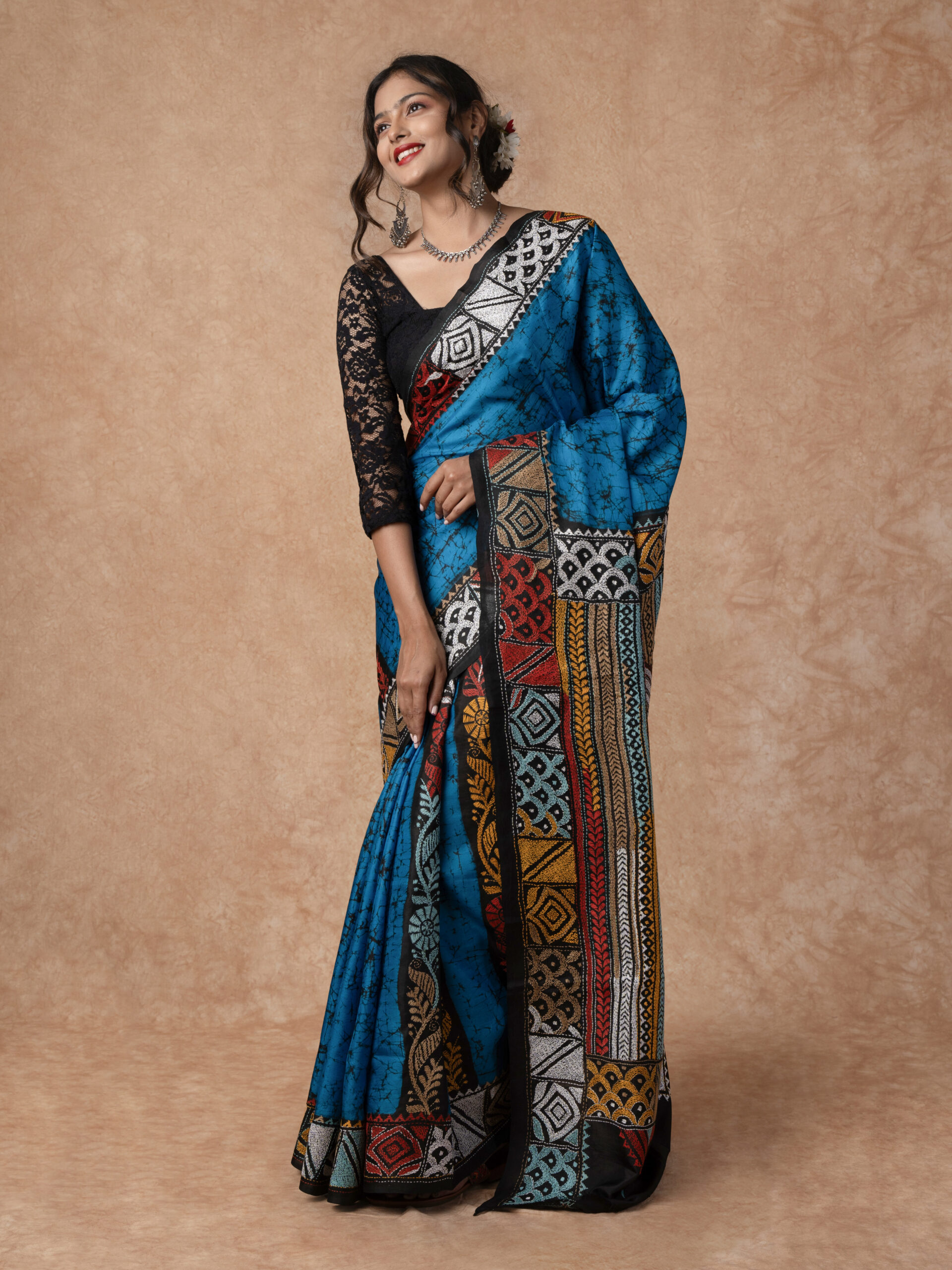 Pure Silk with Silk Mark Tag, Handwoven Kantha Embroidery all over the body of the Saree, Batik print design, with contrast colour blouse piece with Kantha Embroidered border.