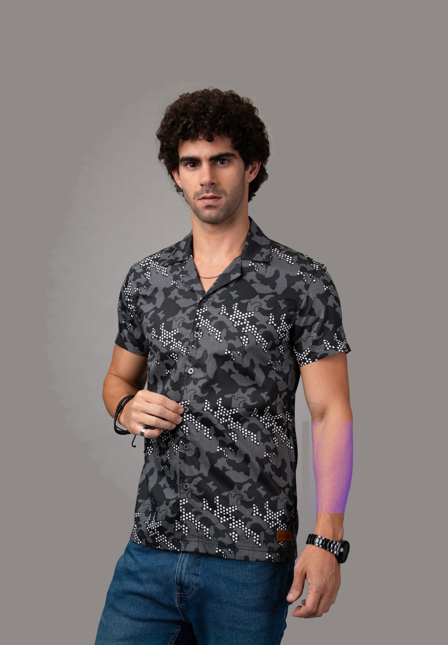 A classic half sleeve shirt and, styled with black, white and Ash Digital Satin print, 100% cotton fabric, crafted with soft stretchable light weight fabric, a modern stylish look finished with matching button provided with extra button. Invest in comfort and style that never goes out of fashion.