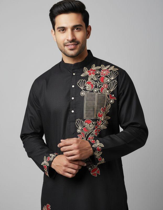 This  hand-painted men’s kurta is brought to life by skilled artisans, featuring distinctive motifs inspired by India’s traditional art forms. Thoughtfully crafted using sustainable practices, each piece reflects Dharitri Creations’ belief in preserving heritage, empowering artisans, and creating timeless elegance with a conscience