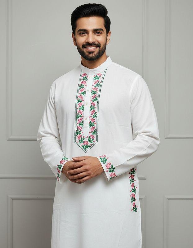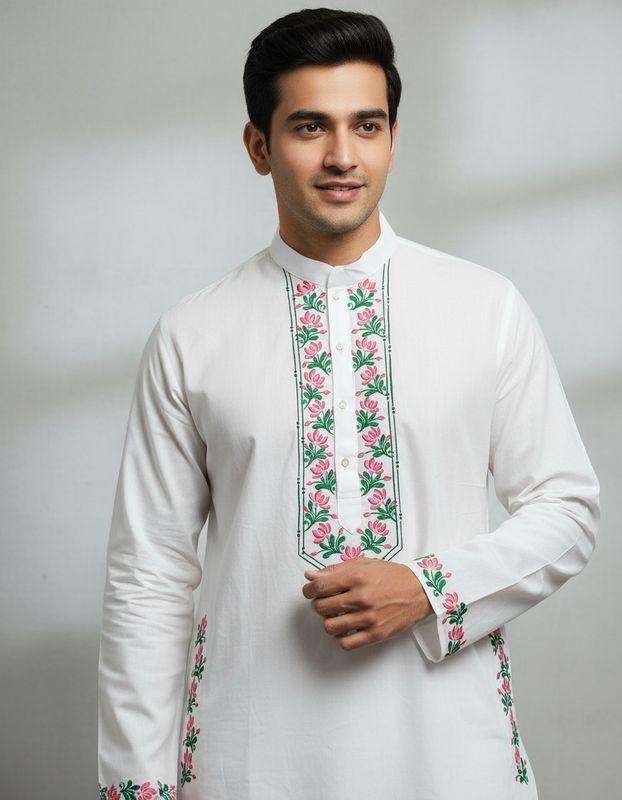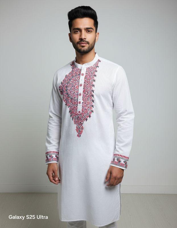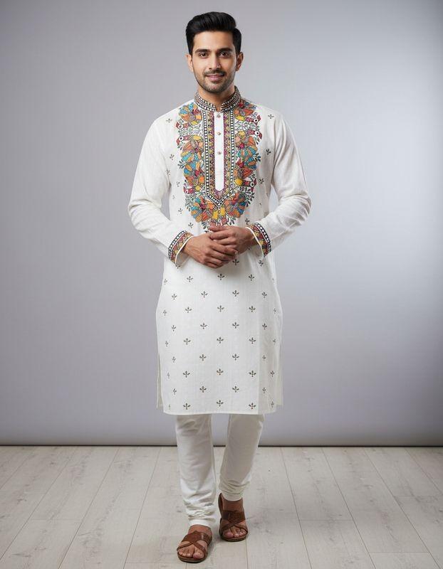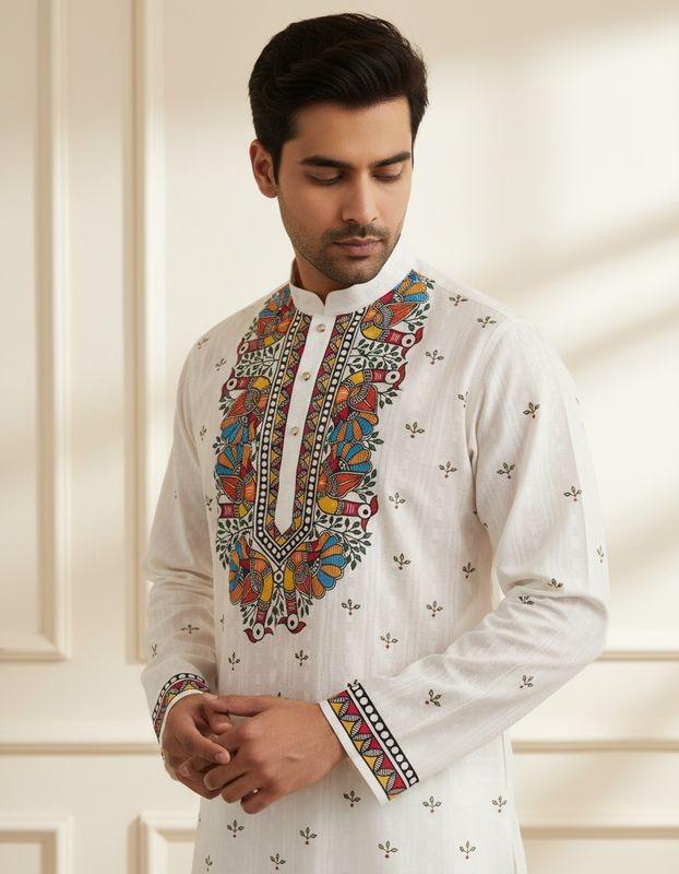 This  hand-painted men’s kurta is brought to life by skilled artisans, featuring distinctive motifs inspired by India’s traditional art forms. Thoughtfully crafted using sustainable practices, each piece reflects Dharitri Creations’ belief in preserving heritage, empowering artisans, and creating timeless elegance with a conscience